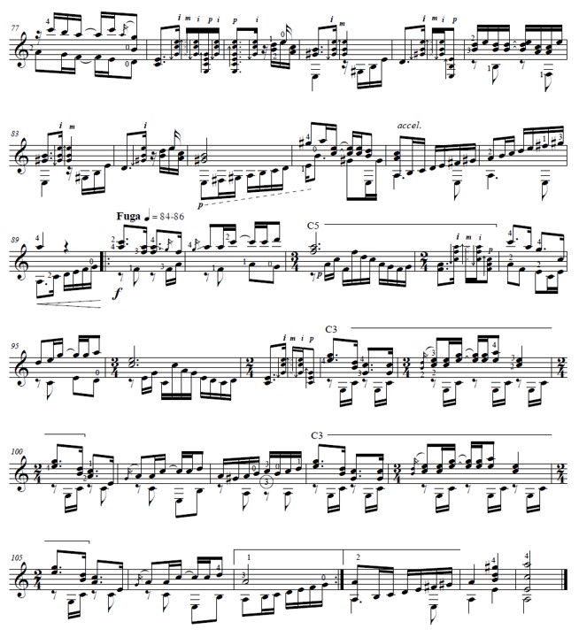 Las frases segunda y tercera son exactamente iguales, estas se reducen a cinco compases cada una, debido a la inclusión de un compás de 3/4 que acorta el descanso entre las semifrases. Esta modificación tiene como objetivo incrementar la dinámica rítmica entre las semifrases y el descanso se reserva para el final de cada frase, una característica propia de las fugas o cachuas: