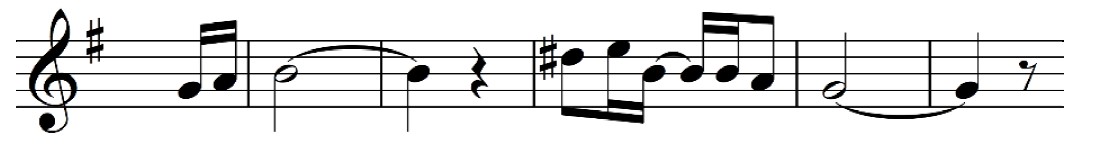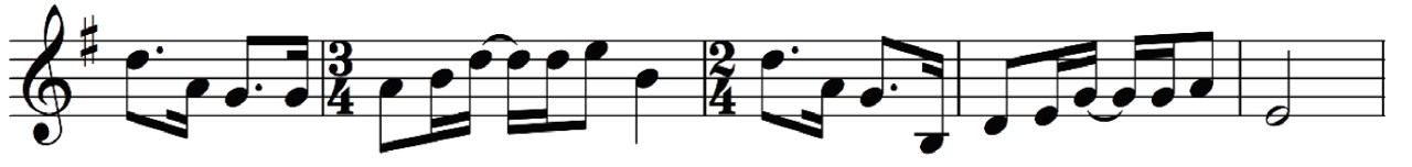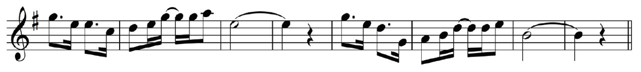 Esta semifrase se repite de manera idéntica, conformando la primera frase, que es binaria compuesta por dos semifrases. Las dos frases restantes siguen la misma estructura de dos semifrases de cinco compases cada una, manteniendo el mismo patrón rítmico, pero con la conducción melódica diferente. Esta semifrase presenta una estructura irregular de 5 compases, característica común en la música tradicional que no sigue modelos académicos establecidos.