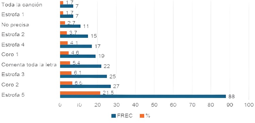 La estrofa 5 de acuerdo con los universitarios que respondieron esta pregunta alcanza el 21.5% de identificación y dice lo siguiente: