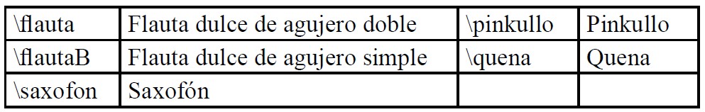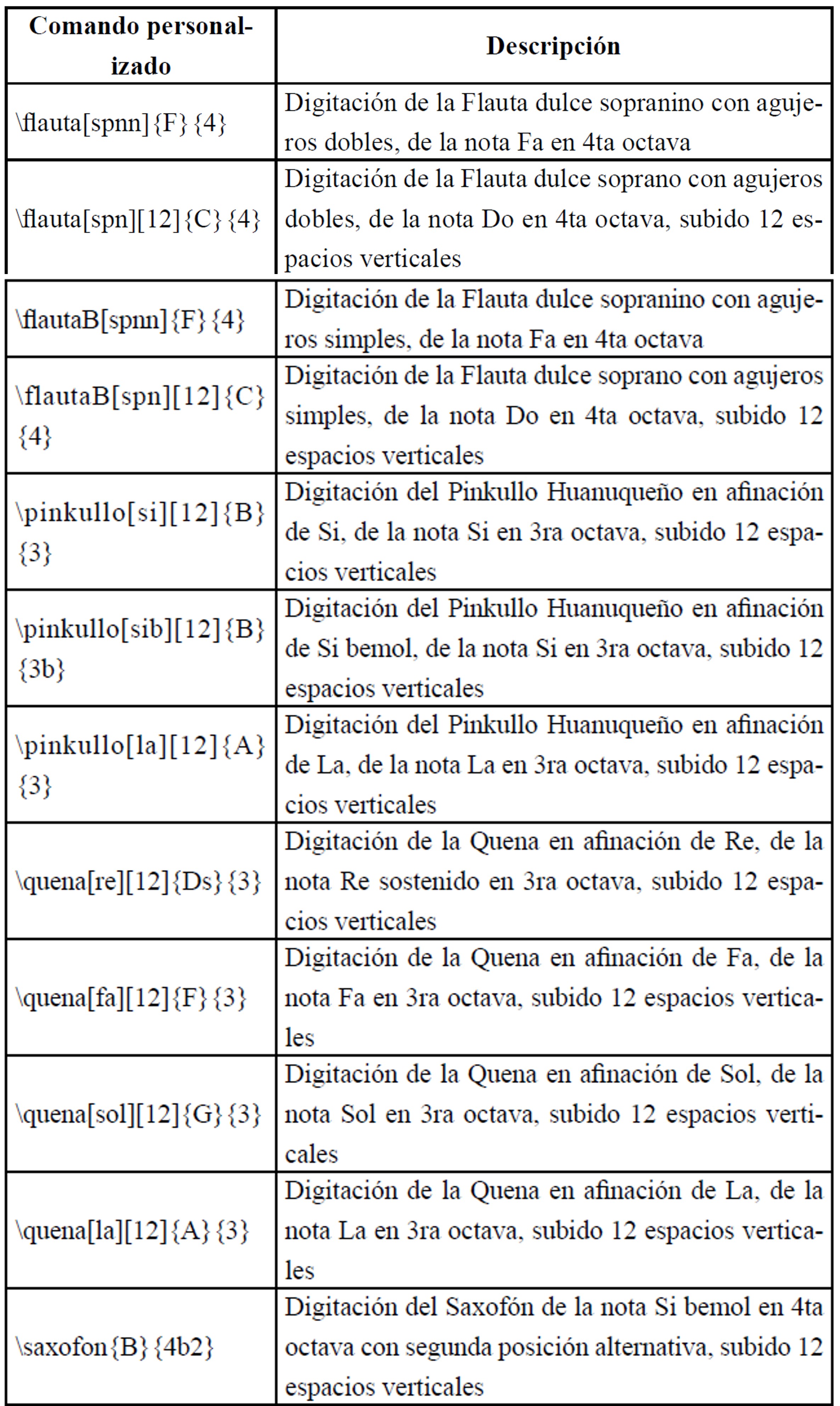 A continuación, se muestran los comandos de la librería personalizada de Latex con Musixtex para la generación de los diagramas de digitación del Pinkullo Huanuqueño, Flauta Dulce, Quena y Saxofón: