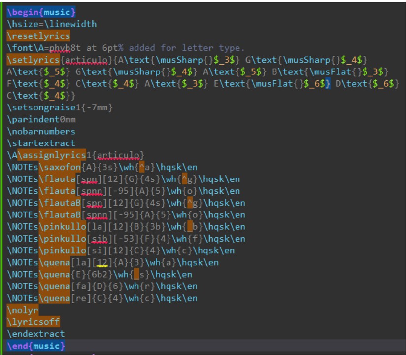 Notación musical con Musixtex: En esta etapa, se utilizar el entorno “music” de Musixtex para incorporar partituras. Se especifica las notas, duraciones y otros elementos de notación musical utilizando comandos proporcionados por Musixtex.