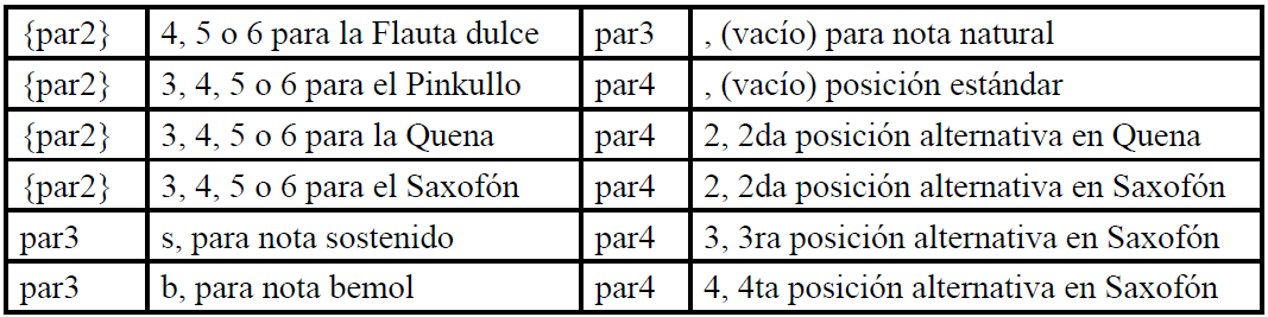 {par2par3par4}: par2 define la octava respecto al piano afinado en 440 Hz, par3 define la alteración en caso se requiera y par4 define las posiciones alternativas.