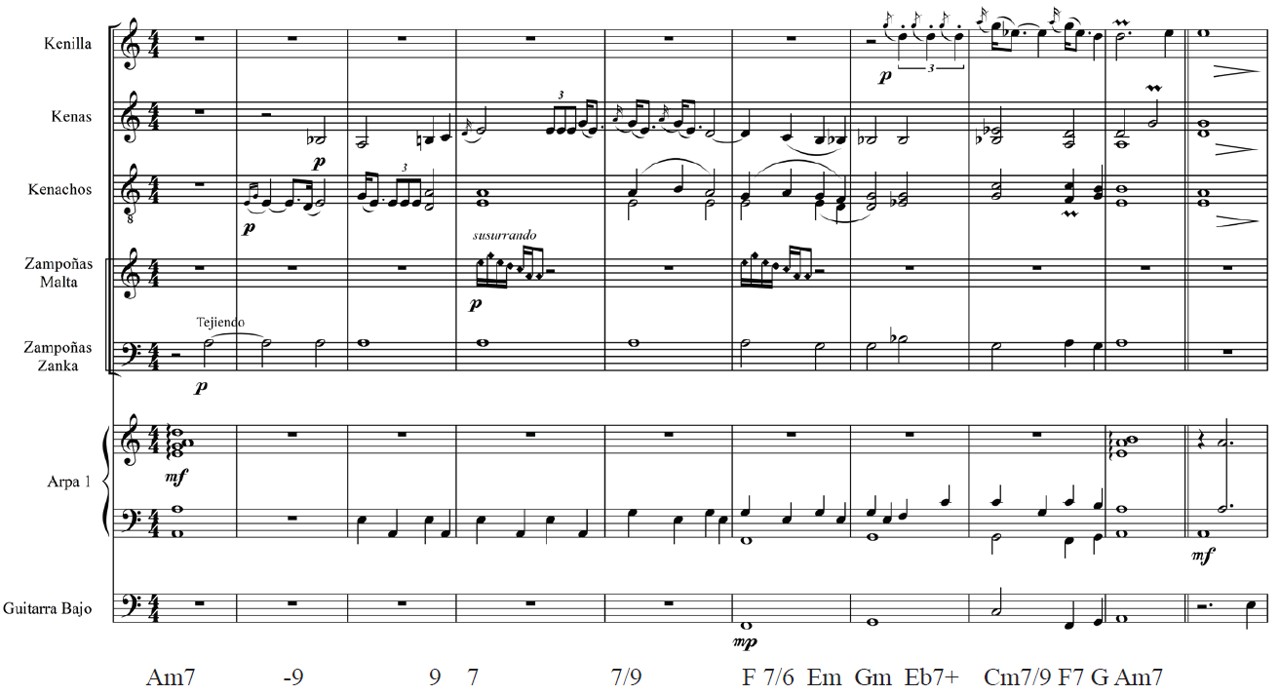 El propósito de utilizar estos efectos sonoros es el de recrear la percepción alterada que se tiene durante la ceremonia, para lo cual se diseñó un entramado de efectos que crea una textura inusual. En la figura 7 se puede apreciar que la kenilla hace el canto de un ave; las kenas recrean los susurros de íkaros del chamán; el kenacho y las zampoñas malta imitan el canto de un ave y los susurros del chamán; las zampoñas zanka, los toyos y las guitarras recrean el sonido ambiental del trance; los acordeones realizan el sonido de los insectos, muy similares a las cigarras; el violín recrea el sonido del grillo; y la cabaza mantiene el ostinato rítmico que el chamán realiza con sus sonajas.