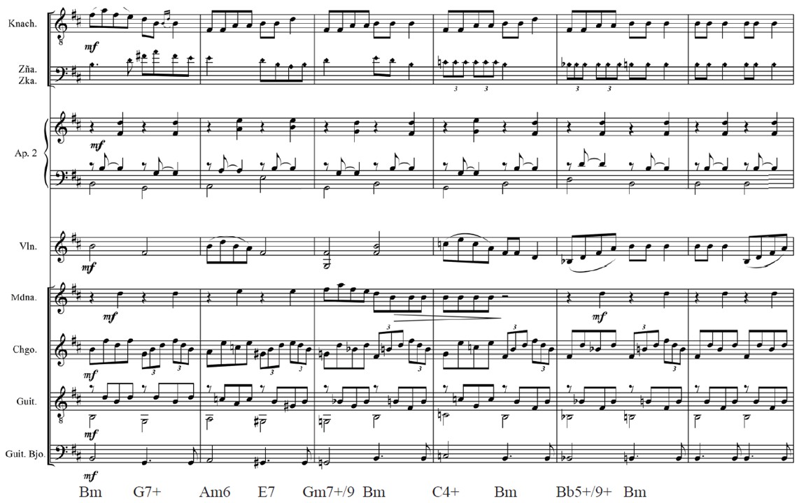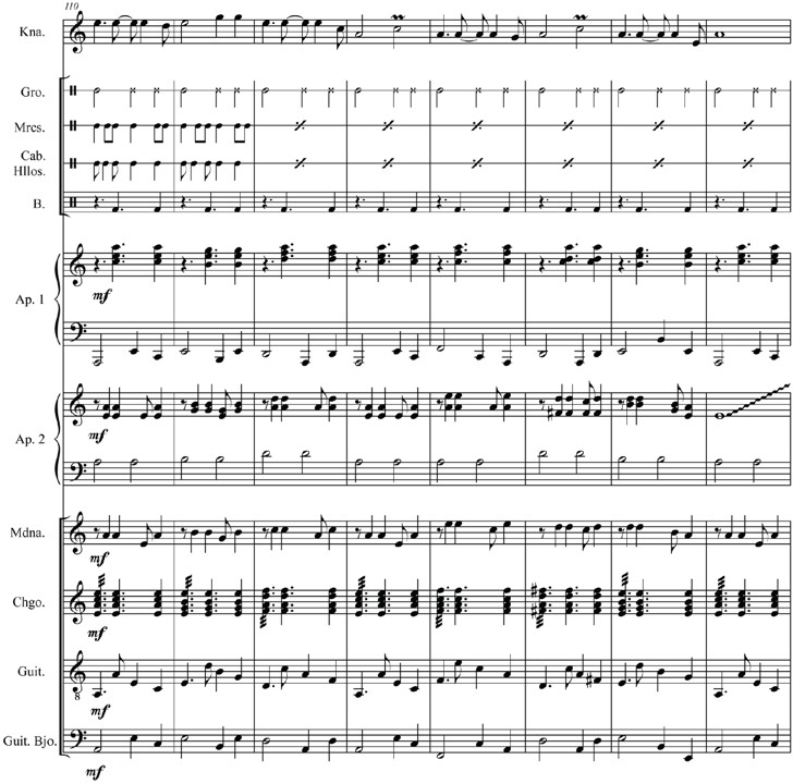 Para la introducción, se configura sobre un ostinato de negras para representar el ritual (ejemplo en la figura 5); luego, al presentarse la melodía del primer íkaro, se desarrolla una textura basada en el uso de polirritmos, los cuales ayudan a representar los primeros estadios alterados de la percepción (ejemplo en la figura 6). Para la segunda parte, el entramado polirrítmico plantea un desarrollo mayor con el propósito de recrear el mundo surrealista de la fauna amazónica (ejemplo en la figura 7). En la tercera parte, el desarrollo rítmico pone énfasis en el uso de ritmos que configuran patrones propios de las danzas amazónicas; este desarrollo, a manera de danza, proviene de la estructura rítmica del íkaro (figura 3). Los instrumentos de percusión mantienen un patrón rítmico caracterizado por el uso de síncopas, a esta tendencia se suma el registro agudo de las arpas, la mandolina y el charango, los demás instrumentos se anclan en la métrica regular del compás, tal como se observa en la figura 8: