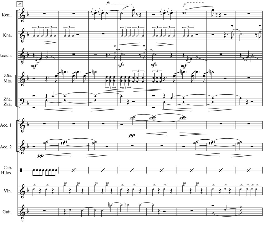 La obra continúa desarrollándose sobre la exposición del primer íkaro. Se mantiene la textura producida por el uso de polirritmos y las imitaciones melódicas que se construyen con fragmentos del íkaro, tal como se aprecia en la figura 10: