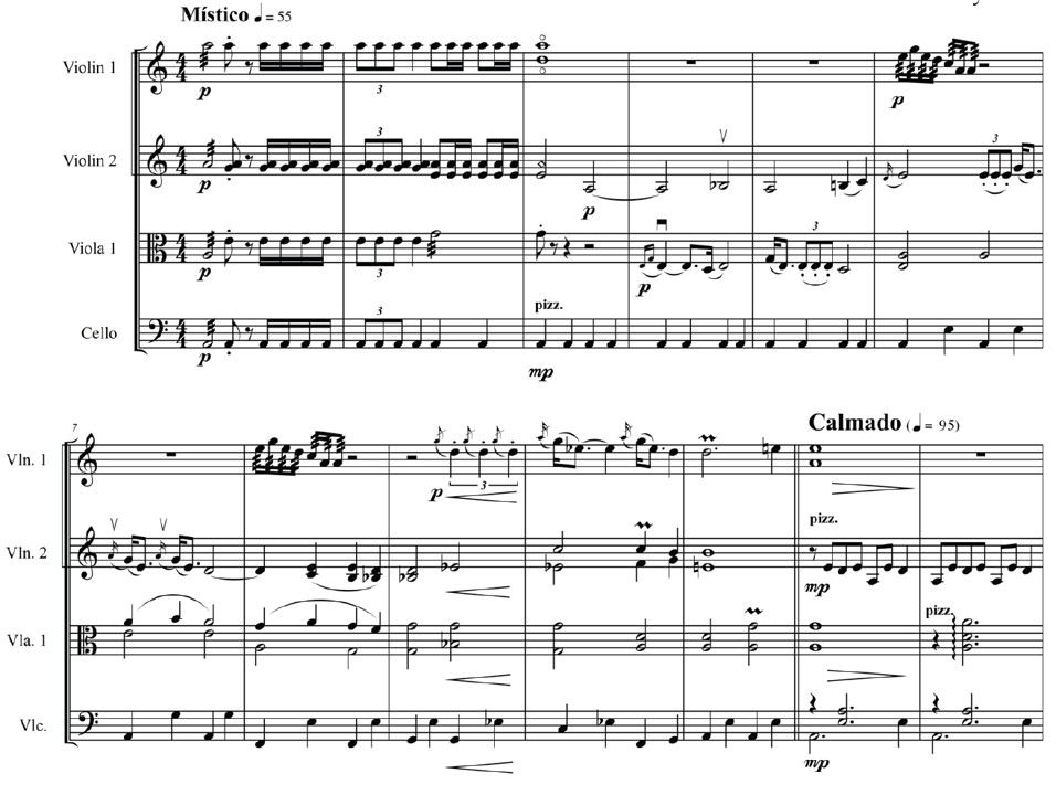En la figura 9 se aprecia el ostinato que caracteriza lo ritual, representado en las negras de la parte del cello en pizzicato. El primer violín presenta fragmentos de un íkaro haciendo uso del trémolo y en los siguientes compases manifiesta el canto de un ave. El segundo violín y la viola también presentan el canto de un ave que precede al canto del primer violín, a la vez que se encargan de configurar el contexto armónico.
