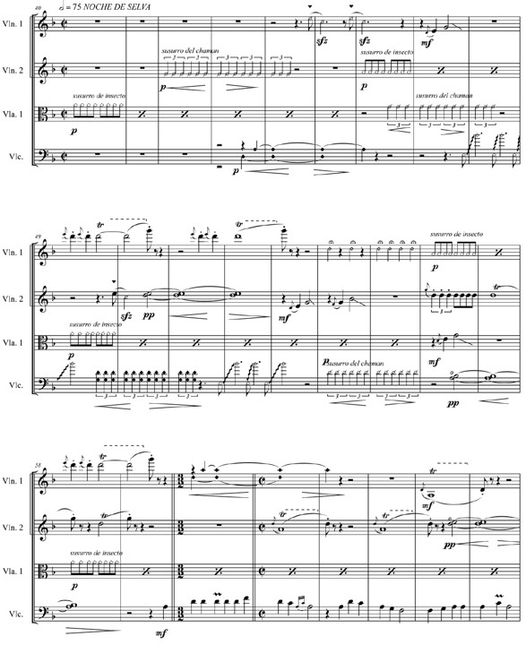 La indicación «susurro del chamán», que se ejecuta de forma intercalada entre el segundo violín, viola y chelo, es un ritmo de tresillo que señala que, mientras se toca el efecto de armónico sobre la nota indicada, el ejecutante debe emitir aire haciendo uso de su soplido. Otro elemento de similar característica aparece en el primer violín (anacrusa del c. 45) y segundo violín (anacrusa del c. 50); la diferencia radica en que el primer sonido que se ejecuta con el violín debe estar acompañado de la emisión de aire con la letra «s», indicada con un pequeño triángulo sobre la nota.
