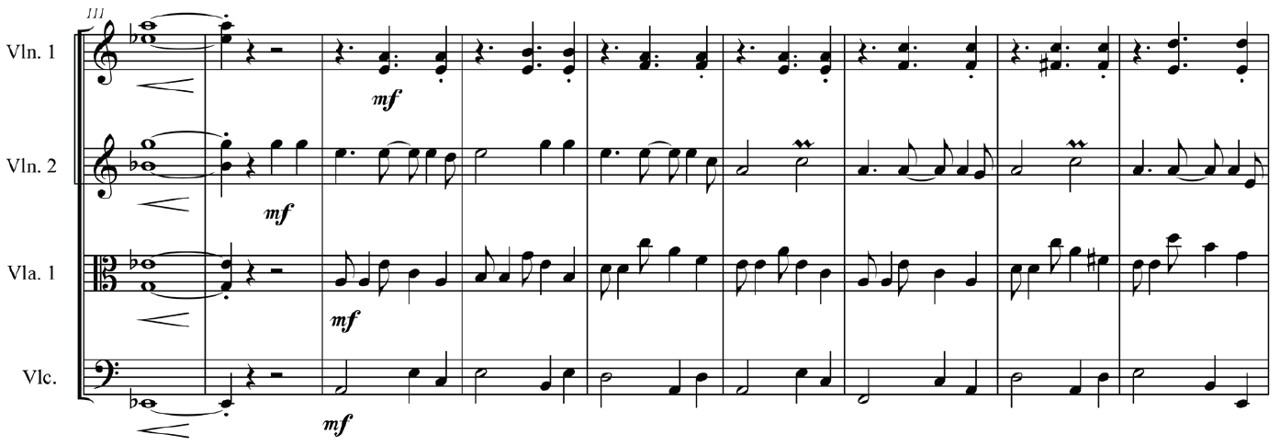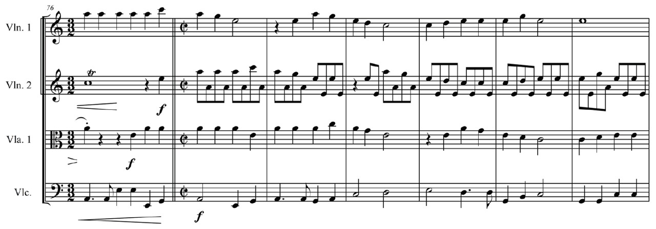 Nótese en esta partitura que la imitación a la octava mantiene la misma figuración en el primer violín y viola, mientras que el segundo violín alterna la melodía con notas en corcheas que pertenecen al contexto armónico.
