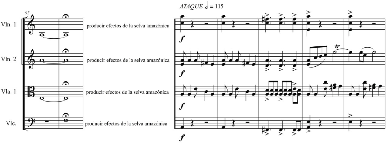 La tercera parte, «Ataque», está precedida por un momento en donde los músicos deben producir, de manera aleatoria, sonidos o efectos que simulen la selva amazónica; luego de este momento de tiempo indeterminado, se desarrolla una sección a manera de introducción, cuyos elementos rítmicos se caracterizan por el uso de síncopas que son propias de las danzas amazónicas del Perú (figura 13).