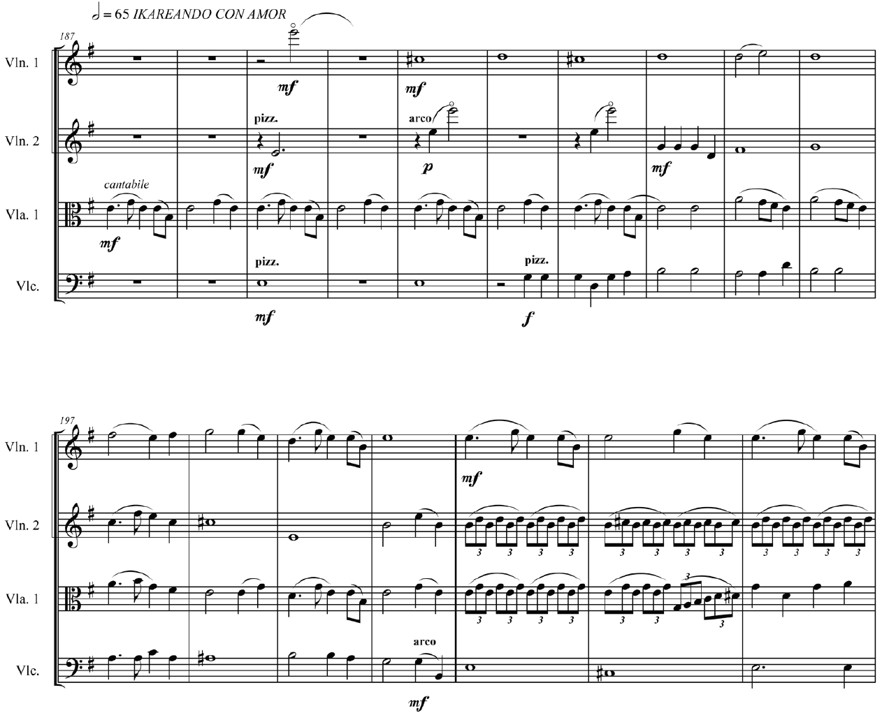 La parte final, denominada «Ikareando con amor», expone el íkaro principal en el canto de la viola desde el c. 187 hasta el c. 200. Luego pasa el canto al primer violín, en esta primera exposición se genera un contrapunto con los pizzicatos del chelo, mientras que las otras voces realizan efectos de armónicos y notas propias del contexto armónico; a partir del c. 201, el acompañamiento se realiza en grupos de dos tresillos o también se puede ver como agrupaciones de seisillos. Este movimiento rítmico, aunado a las notas largas del chelo, busca representar la atmósfera del momento mágico surrealista (figura 16).