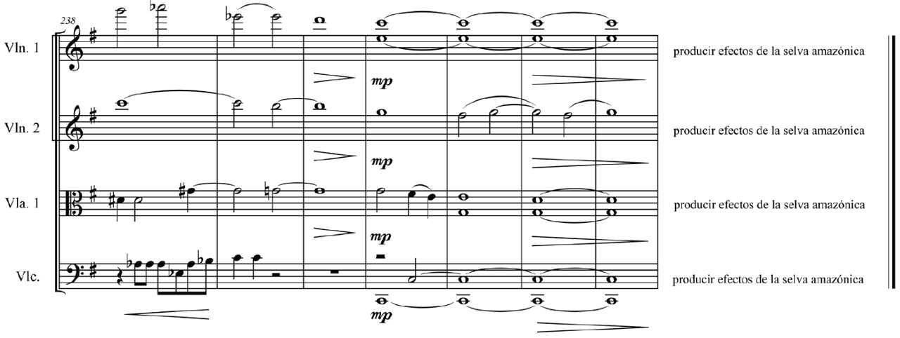 En la figura 18 se muestra el final de la obra, que incluye el uso de notas prolongadas que forman acordes de colores consonantes. También se incluyen algunas reminiscencias de un íkaro en el chelo. Finaliza la obra extinguiendo el último acorde con un regulador de intensidad que disminuye la sonoridad hasta fusionarse con el silencio ambienta; seguidamente los instrumentistas reproducen sonidos aleatorios, incluyendo efectos y otros, que caracterizan a la selva amazónica del Perú.