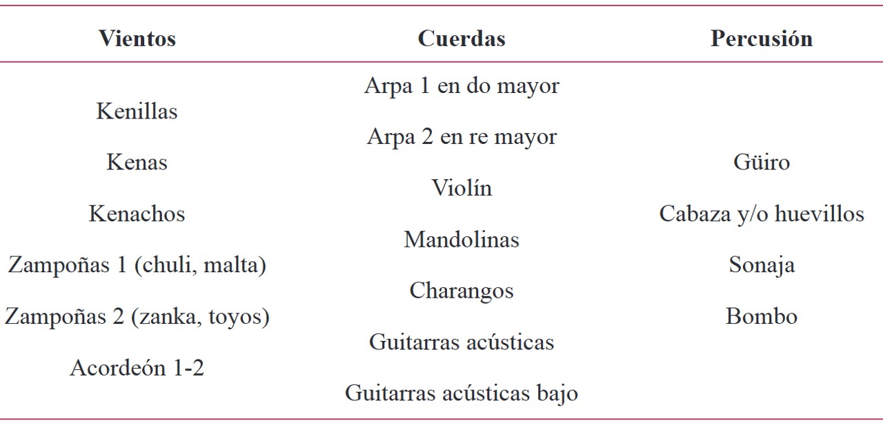 Como parte de su estructura, rescata y utiliza una diversidad de instrumentos de origen peruano, como el siku o zampoña, la quena, la quenilla y el quenacho, así como la tinya, el cajón, los bombos nativos y la percusión hecha a base de semillas silvestres. Todo ello se complementa con los instrumentos mestizos, como el charango, la guitarra y el guitarrón, el violín, la mandolina, el arpa, el acordeón y la percusión.