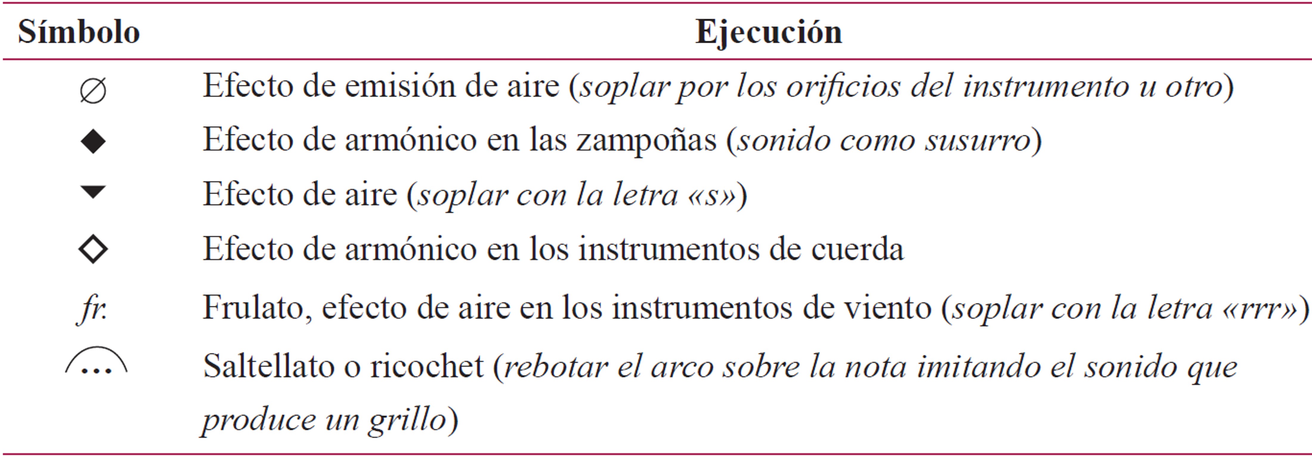 La obra incluye una sección informativa que describe la manera en que se debe ejecutar estos sonidos particulares. En el score se incluye una leyenda de símbolos para efectos sonoros, tal como se muestra en la tabla 3: