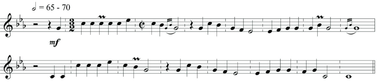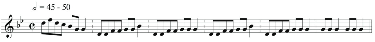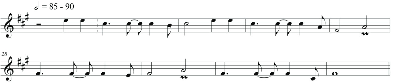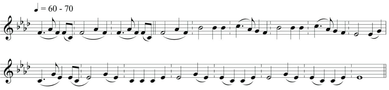 Se circunscribe al sistema tonal con el propósito de facilitar, tanto en los músicos como en el oyente, un entendimiento de las características tonales de las melodías, así como un entendimiento emocional de los pasajes narrativos; sin embargo, y como recomendaría el maestro Holzmann, he buscado matizar cada parte hasta donde sea posible, para lograr su presentación de acuerdo a un sentir contemporáneo, como en los siguientes ejemplos: