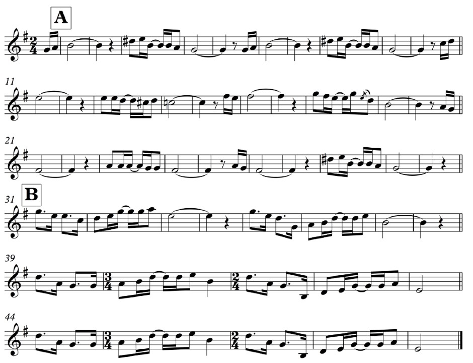 Esta semifrase se repite de manera idéntica, conformando la primera frase, que es binaria compuesta por dos semifrases. Las dos frases restantes siguen la misma estructura de dos semifrases de cinco compases cada una, manteniendo el mismo patrón rítmico, pero con la conducción melódica diferente. Esta semifrase presenta una estructura irregular de 5 compases, característica común en la música tradicional que no sigue modelos académicos establecidos.