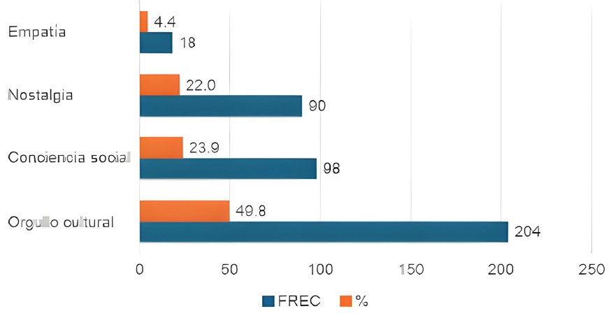 Respecto al sentimiento que genera, el 49.8% indica que es el orgullo cultural principalmente, conciencia social (23.9%) y nostalgia (22%). De estos tres sentimientos, el que predomina es el de orgullo cultural en los dos grupos mencionados anteriormente y seguido de nostalgia entre quienes tienen entre 19 y 21 años y de conciencia social para los jóvenes de 16 a 18 años.
