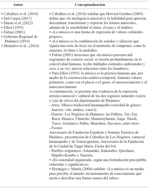 Asimismo, la música es un medio para percibir el mundo, un instrumento de conocimiento que incita a decifrar una forma sonora del saber (Montalvo y Moreira, 2016; Angel, 2013; Caballero y Curiel, 2018; Duran et al., 2022). Además, la música ha sido siempre una forma de expresión cultural de los pueblos y de las personas a través de la que se expresa la creatividad (Del Carpio, 2017; Meza et al., 2024).