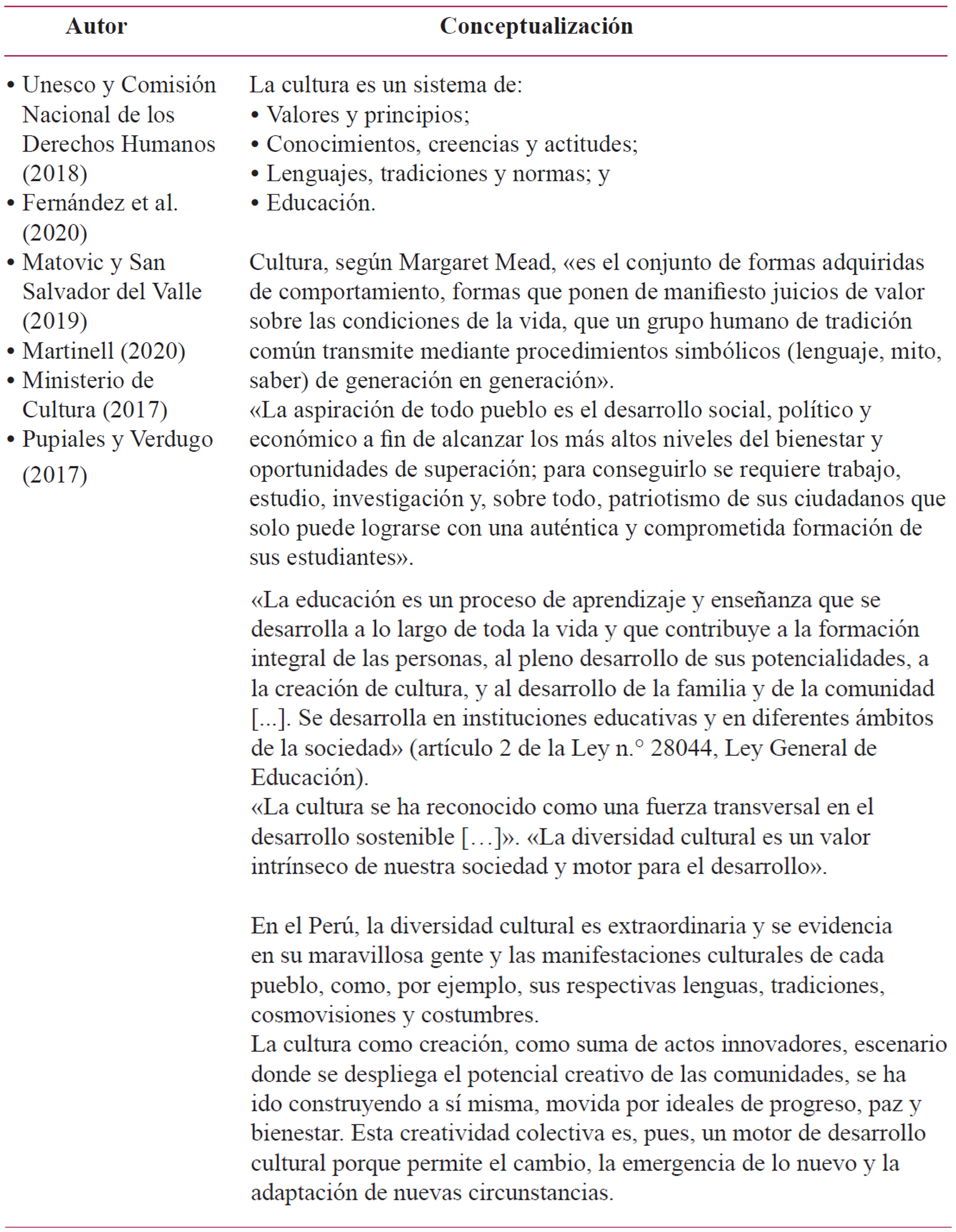 La cultura como concepto complejo tiene una gran variedad de elementos (valores, principios, creencias, expresiones artísticas, lenguaje, conocimiento, símbolos, objetos), los cuales son transmitidos de generación en generación (Unesco, 2018; Bolívar, 2019; Pupiales y Verdugo, 2017). Asimismo, nos damos cuenta de que, a través del tiempo, la cultura evoluciona en respuesta a los cambios sociales, económicos y tecnológicos (Matovic y San Salvador, 2019; Martinell et al., 2020; Fernández et al., 2020; Ministerio de Cultura, 2017).