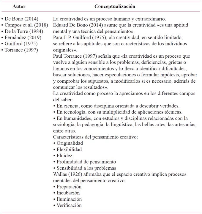 La creatividad como proceso dinámico es la base y motor del desarrollo humano que permite el progreso cultural de todos los pueblos, impulsando la innovación, la resolución de problemas y la adaptación a nuevos desafíos (De Bono, 2018; De la Torre, 2022; Campos y Palacios, 2018). Además, fomenta la expresión individual y colectiva, enriqueciendo el patrimonio cultural y generando nuevas formas de conocimiento y expresión (Fernández, 2019; Carranza, 2021).