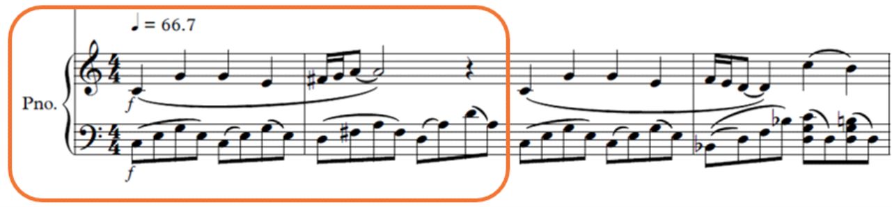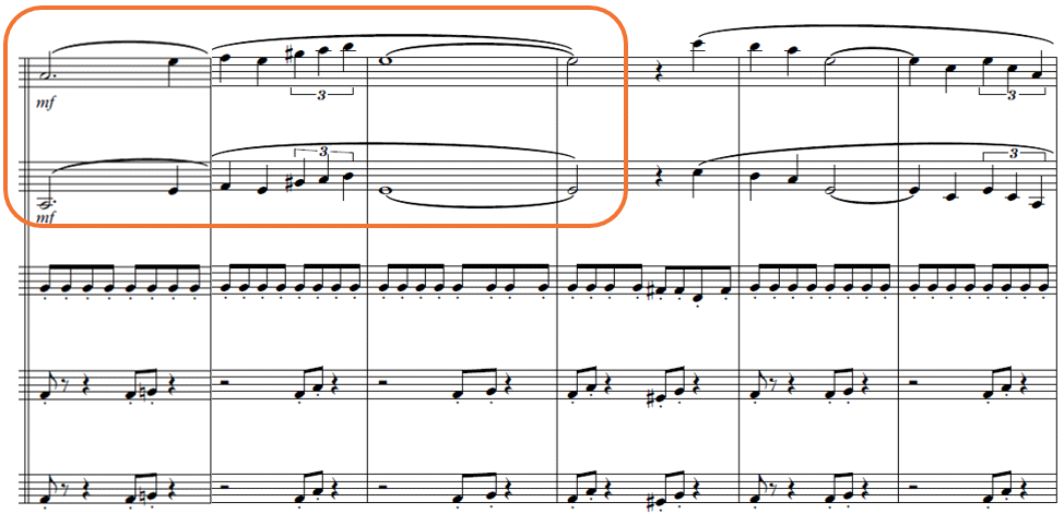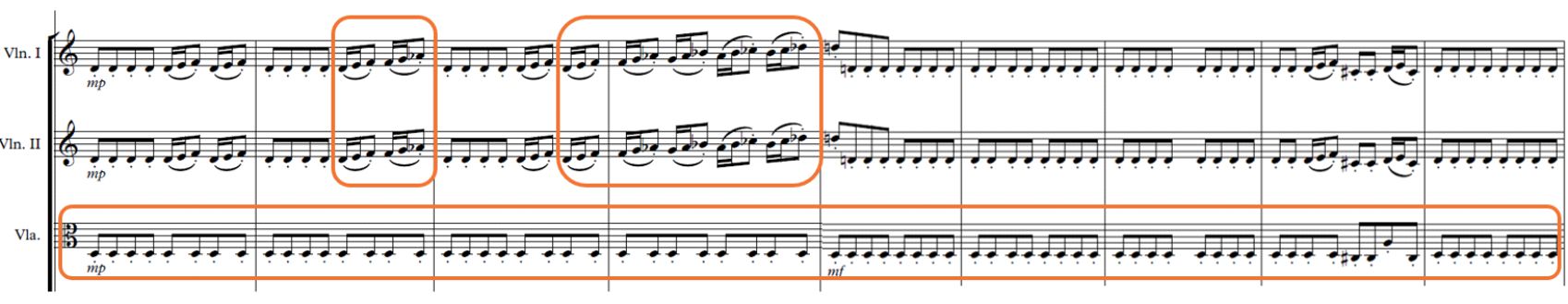 Escala octatónica (compás 5, 6 y 7); Primer ostinato/ sobre las violas (desde el compás 1)