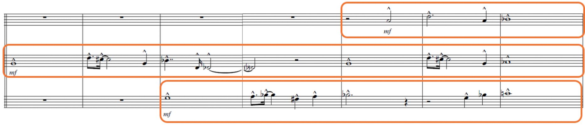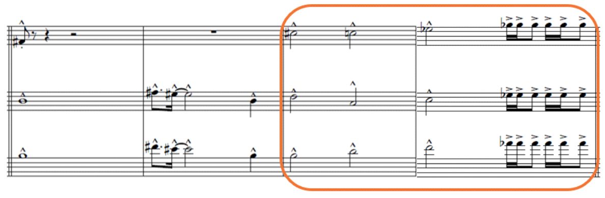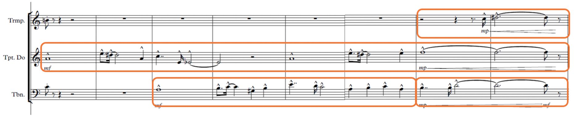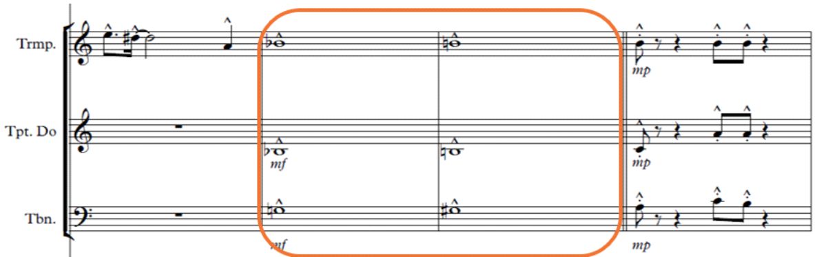 Segundo contrapunto imitativo libre a dos partes sobre el primer motivo/ trompeta y trombón (compás 77); Fin de frase en campana (bell) para preparar la modulación cromática/ trombón y corno (compás 83)