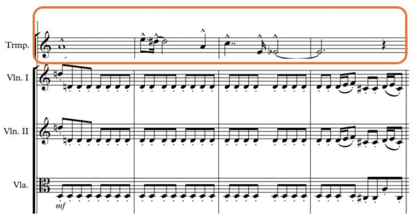 Contrapunto imitativo libre a tres partes sobre el primer motivo/ corno, trompeta y trombón (compás 101)