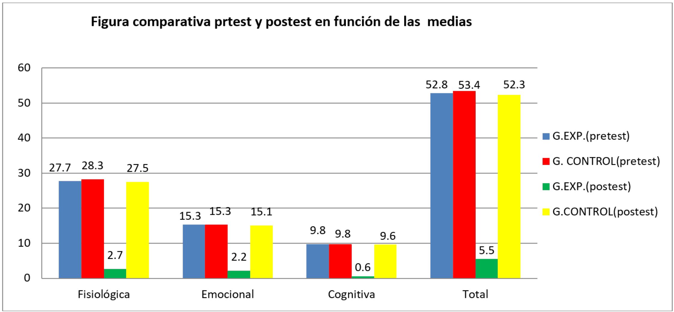 En cuanto a los resultados de las medidas estadísticas, en el pre test el grupo experimental y control obtuvieron las siguientes medidas: la media aritmética del grupo experimental fue de 52,8 y del grupo control 53,4, tal como se ilustra en la tabla 1 y figura 1. En el post test el grupo experimental obtuvo una media de 5,5 y el grupo control 52,3. Estos datos confirman la eficacia de la aplicación del programa experimental. Mientras que en el post test, el grupo control, continúa con los resultados obtenidos en el pre test. En el grupo experimental, es evidente la disminución significativa de los niveles de ansiedad, en concordancia a lo que afirma Jacobson, que con la práctica sistemática el organismo obtiene la relajación profunda.