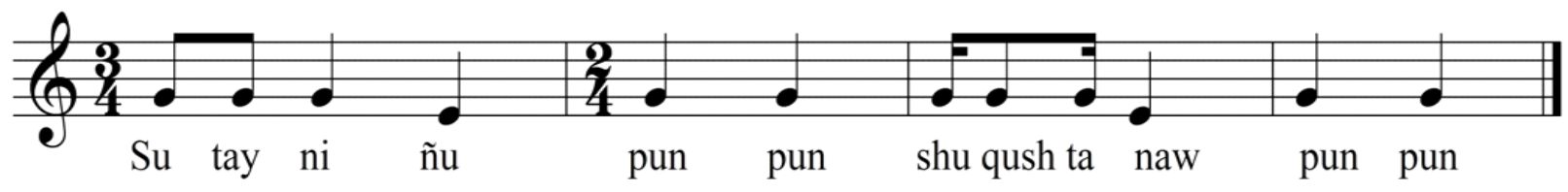 El huaino, definido por Pacheco como “una carcajada sarcástica a la vida…” (p. 28), aparece en la reconciliación y el cierre teatral, marcando la armonía comunitaria. La mulisa, variante del hajarahui, cierra el ciclo ritual con un canto de despedida que evoca el retorno a la cotidianidad.