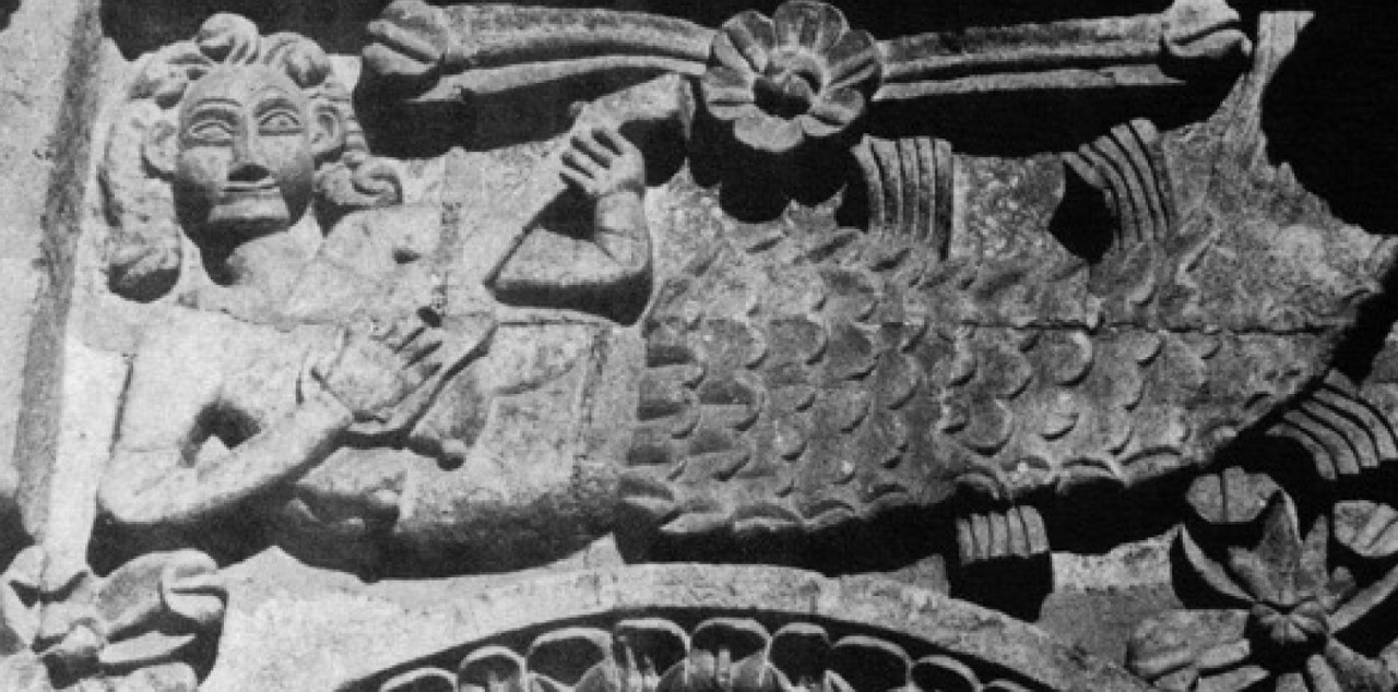 Sirena tocando un cordófono pequeño. Relieve de la catedral de Puno. Foto: Erhardt Jahnke.