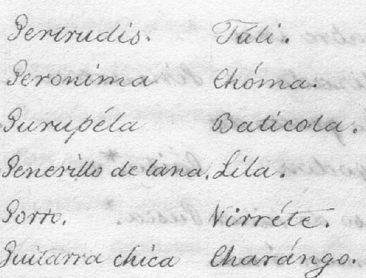 Constatar una posible participación de mujeres en la tradición del charango durante la colonia nos llevaría a reescribir por completo la historia del instrumento y a reformular las noticias que tenemos sobre su función como instrumento en el cortejo amoroso entre jóvenes como lo han demostrado autores como Turino (1983), Solomon (1997) y Stobart (2006) en Bolivia y en el Perú. Recurriendo a la metodología histórica, puedo decir que es muy poco probable que todas las huellas de prácticas musicales femeninas con el charango, con excepción de la arriba citada, hayan desaparecido. Así que más provechoso me parece tratar de explicar un posible error en las líneas de Fernández de Castro y Bocángel que empezar a imaginarnos amazonas charanguísticas.