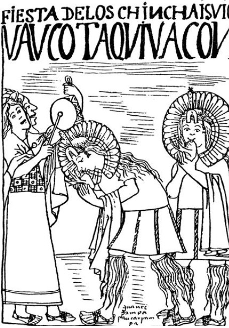 Mujer tocando la tinya en un gráfico de Guaman Poma de Ayala (1613).